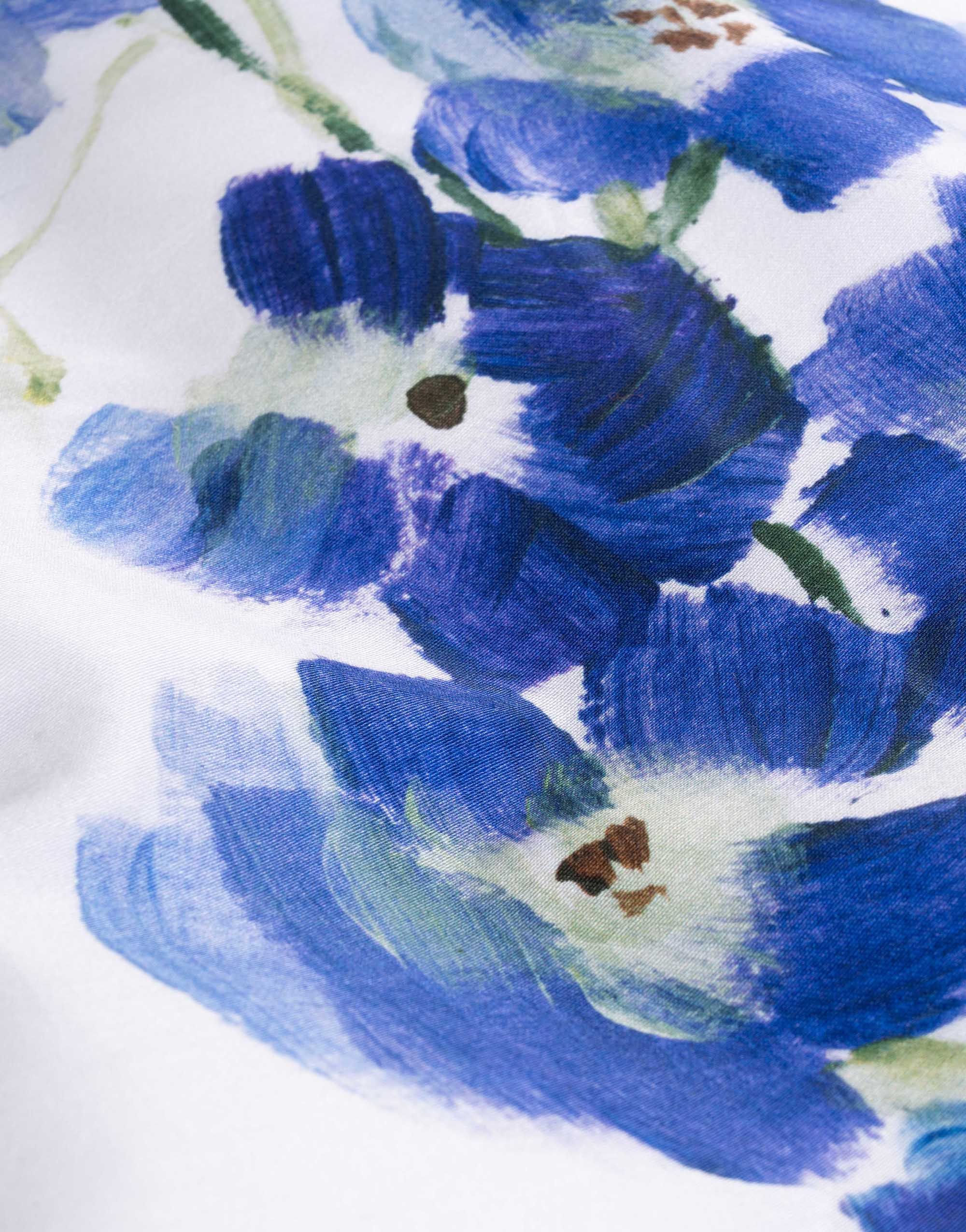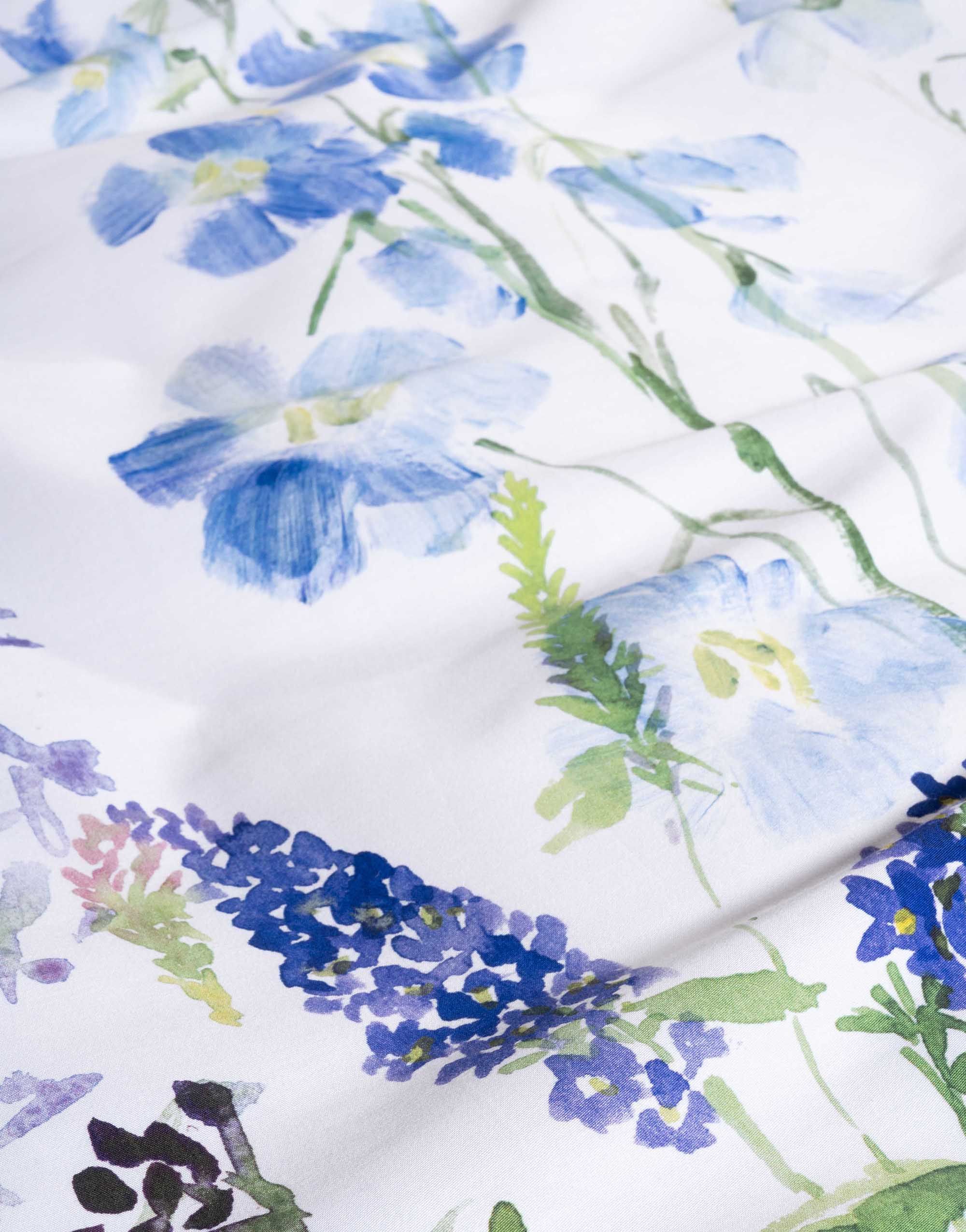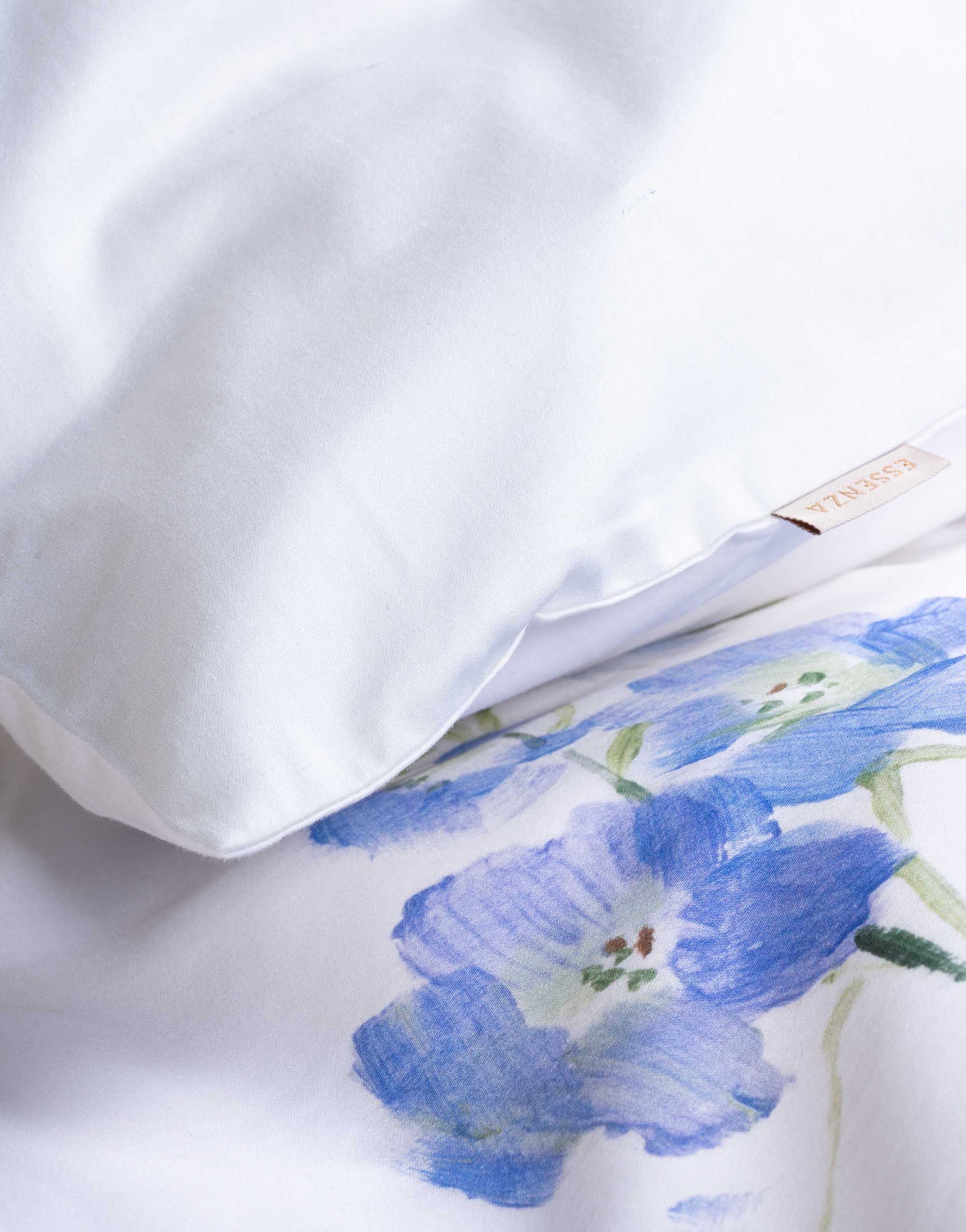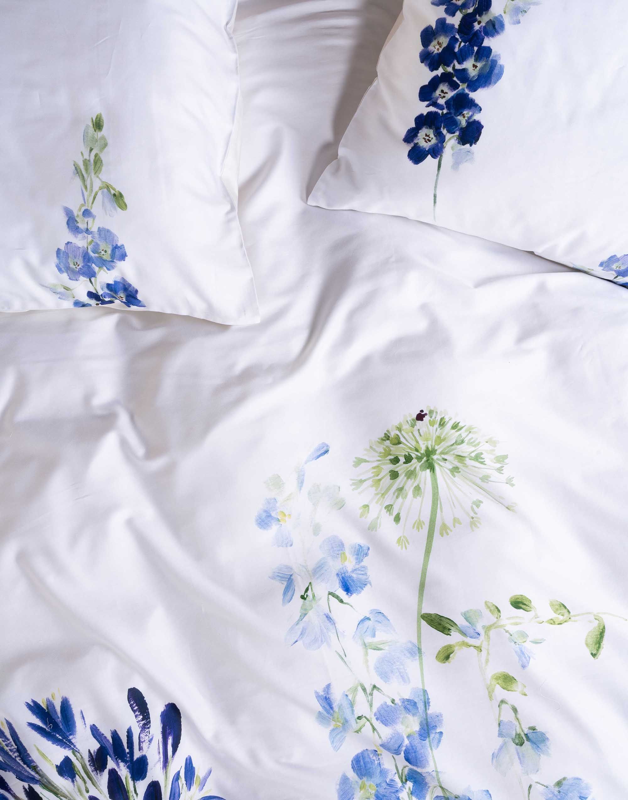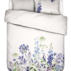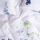 Haal de rust van een aquarelschilderij naar je slaapkamer met dekbedovertrek Lavinea van Essenza. Dit verfijnde dessin toont een losse bloemencompositie in verschillende blauwtinten, subtiel weergegeven op een frisse witte achtergrond. De bloemen lijken met de hand geschilderd en geven het geheel een zachte, kunstzinnige uitstraling.