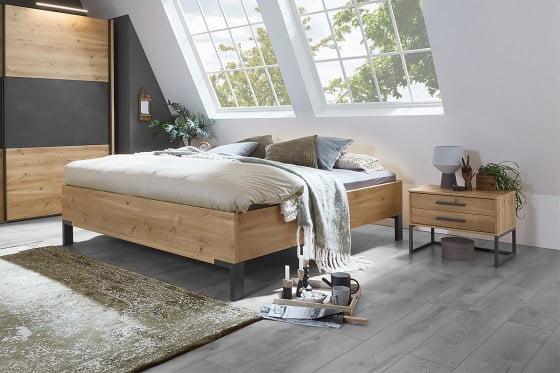 Modern, stijlvol. De natuurlijke uitstraling van het hoogwaardige meubilair in een imitatie bianco-eiken kleur of wit met rawsteel poten, transformeert uw slaapkamer in een moderne loft.